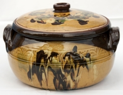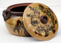 V držadle pokličky je dírka pro odvádění páry. Z obou stran lakováno silnou vrstvou glazury.